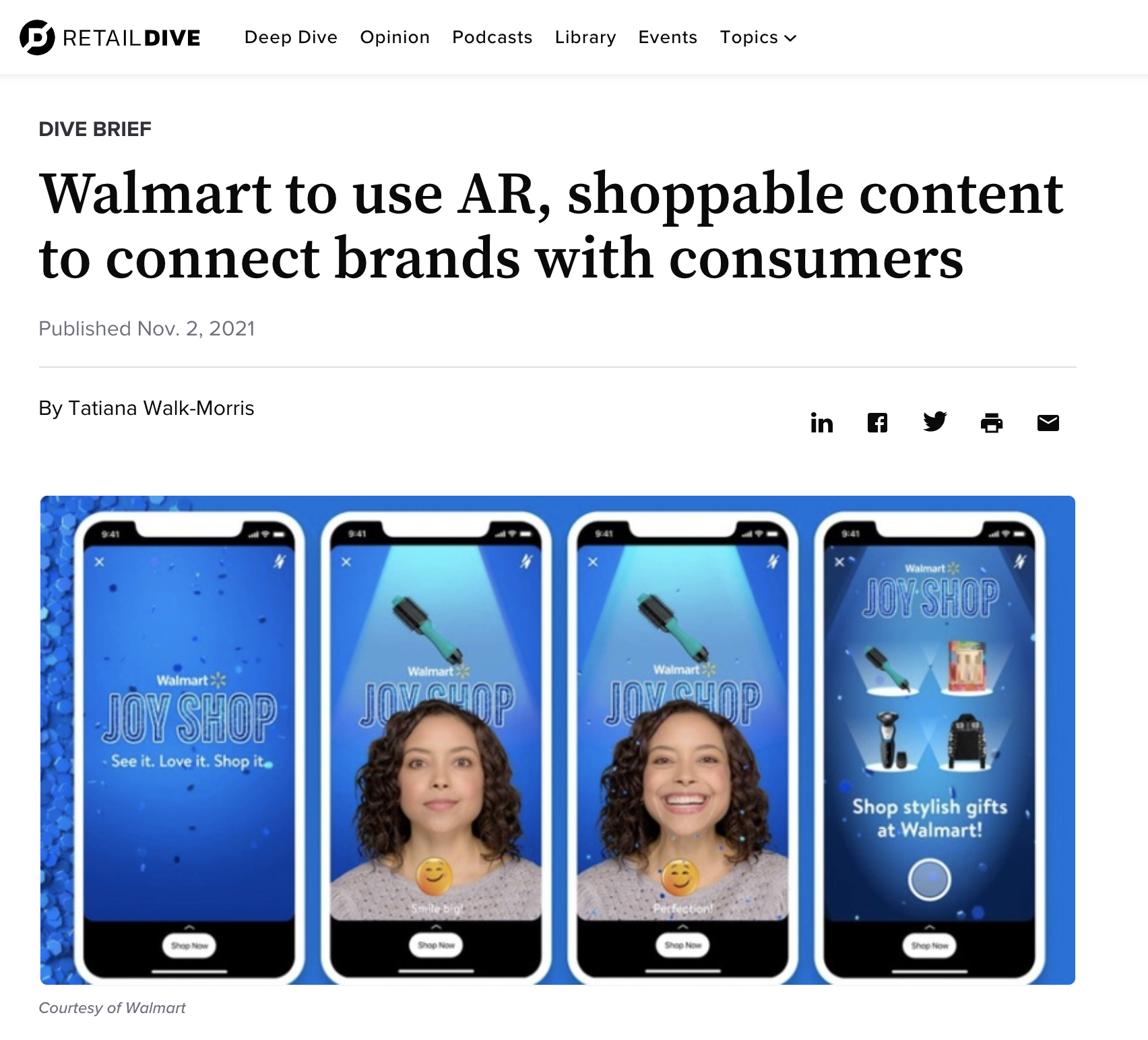 Our idea: We created “Joy Shop,” a never-been-done-before AR experience that empowered users to browse gifts with nothing but their facial expressions. Directly in their environment, users were presented with a series of curated items: If they smiled, nodded, or did anything to the affirmative, we recorded the product as a winner. If not, the filter moved to the next product. In the end, each user was presented with a personalized list based on what made them smile and a link to shop on Walmart.com. We drove to the effect from Feed & Stories ads, as well as QR codes on Walmart’s holiday packaging.