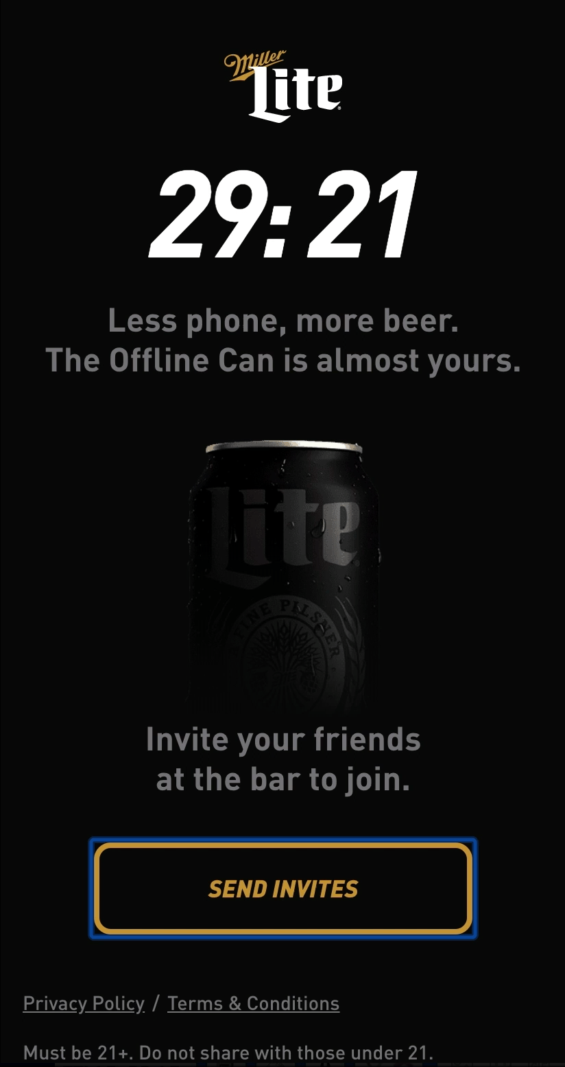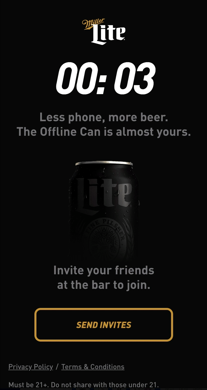Our Innovation: We created the Offline Can, A Facebook Instant Game experience that actually incentivized people to put their phones down to enjoy face-to-face Miller Time with friends at the ever crucial Point of Sale (bars). The more friends disconnected in person, the more rewarding of exclusive, limited edition Offline Cans!