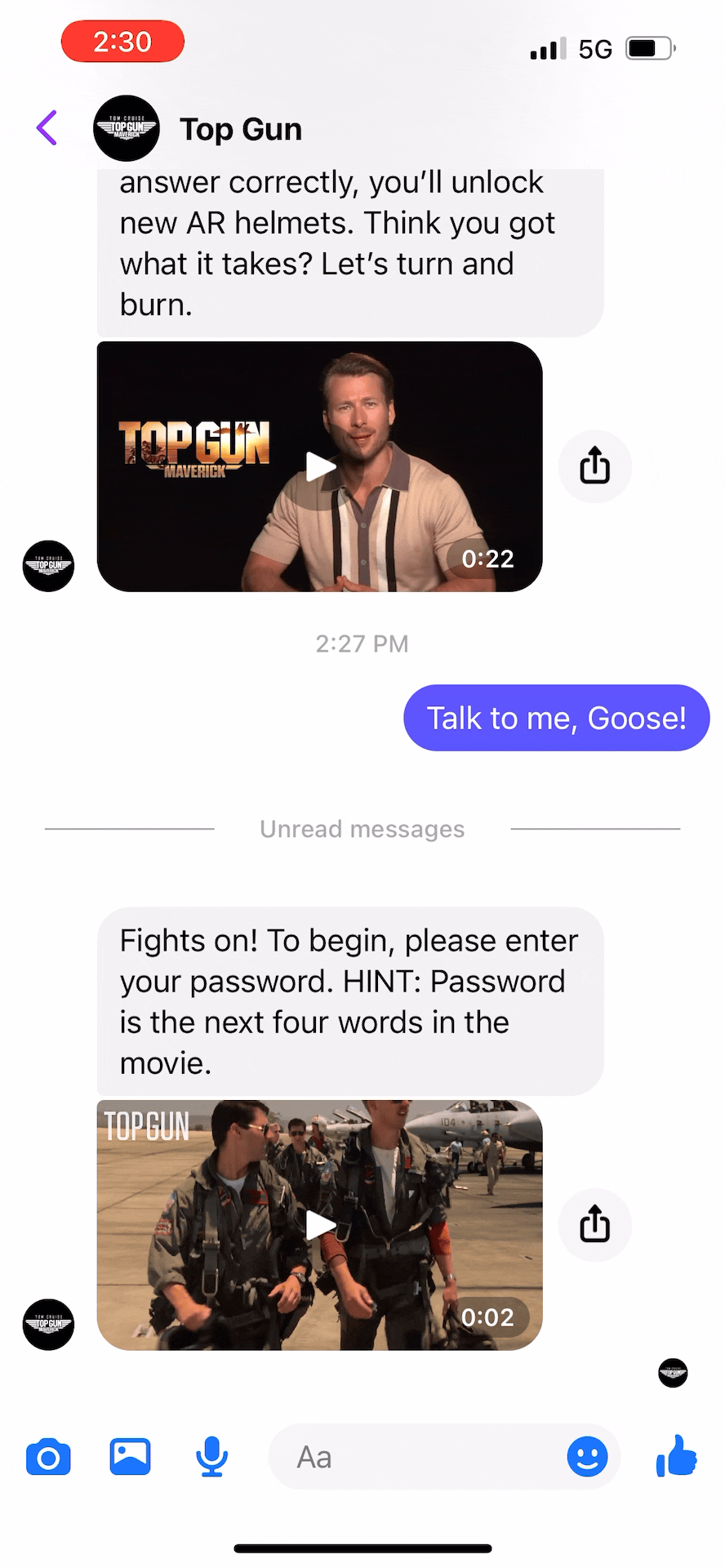 Our Innovation: We first engaged the massive original Top Gun fan-base with an interactive trivia experience we crafted on Messenger. Hosted by star Glen Powell, the game combined nostalgic questions from the original with anticipated footage from the sequel. To expand interest to younger demographics, we then created a series of AR helmets for prizes. As players answered questions correctly, they gained access to ever more exclusive effects.